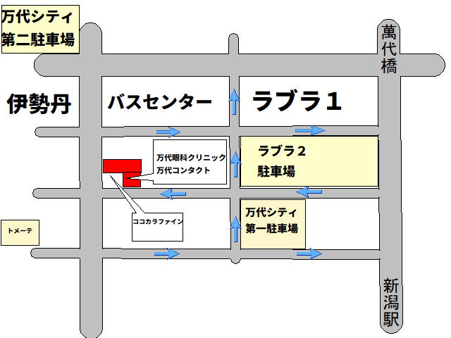 万代コンタクト 〒950-2076 新潟市中央区万代1-3-7 NDK万代ビル1F TEL.025-243-0190 伊勢丹斜め向かい、ココカラファインの隣のアン美容室さんと同じビルです。 駐車場のご案内 提携駐車場 万代シティ第一~第五駐車場ラブラ2駐車場・トメーテ 上記の駐車場のみ最大一時間分のサービス券をお渡しいたします。 駐車券・証明書をご提示頂けない場合はサービス券をお渡し出来ませんのでご了承下さい。 また、最大で一時間になりますので足りない場合はご容赦ください。